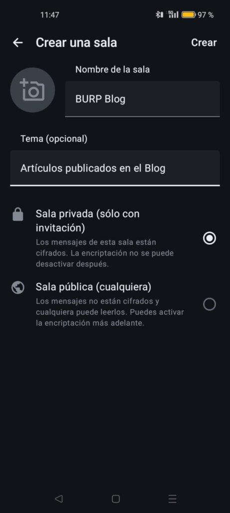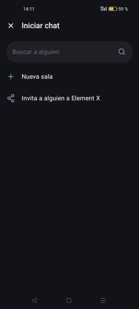 Muy fluida y sencilla. Desde la pantalla principal bastará con entrar en la conversación, grupo o sala deseada y ya nos aparecerá el campo «mensaje» para añadir contenido. Si se trata de de crear uno de nuevo, pulsando en icono inferior derecha nos mostrará las opciones disponibles: buscar personas, crear nuevas salas o invitar a que se unan a Element.