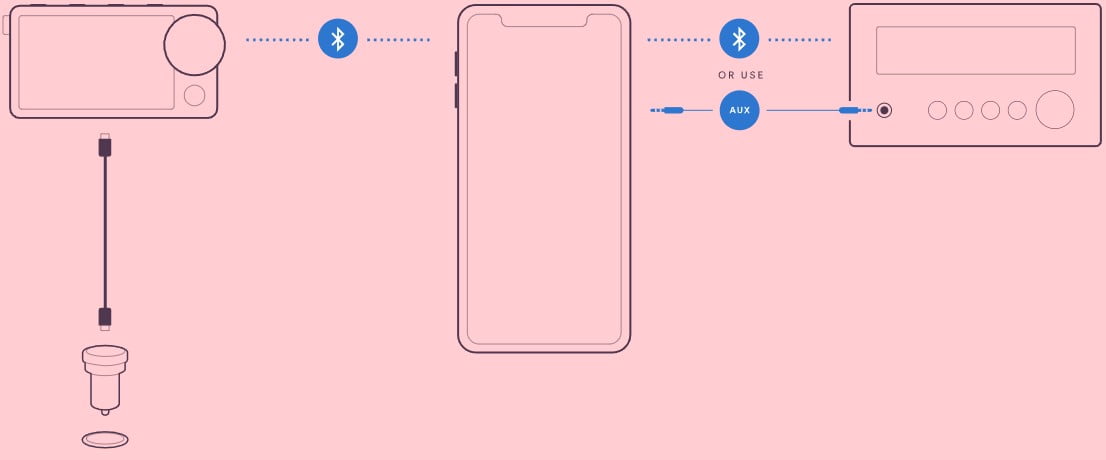 El sistema consiste en alimentar Car Thing con la salida de 12v (mechero) del coche y conectarlo vía Bluetooth al teléfono móvil, y éste a su vez conectarlo al radiocasete del vehículo mediante la salida de audio (mini jack) o también usando conexión Bluetooth.