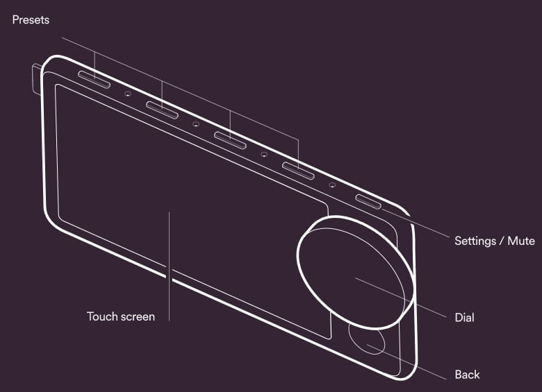 El dispositivo viene con varios anclajes para poder ubicarlo en diferentes posiciones alrededor del radiocasete. Dispone de botones para guardar «presets», pantalla táctil y obviamente la posibilidad de ser controlado mediante comandos de voz.