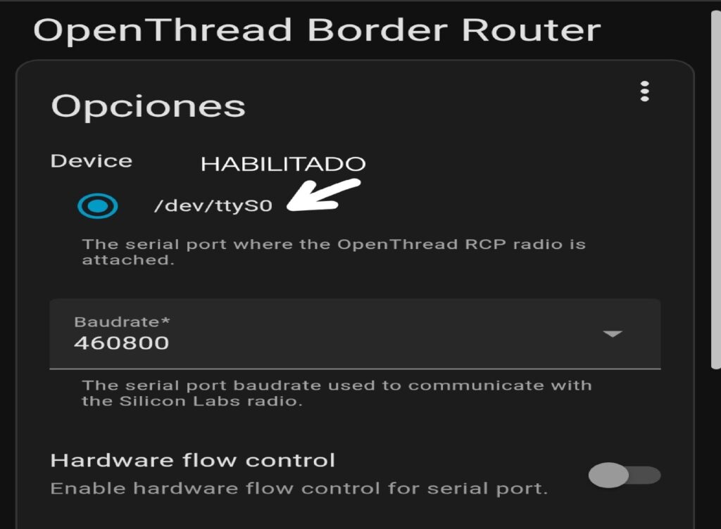 - El complemento OpenThread Border Router lo detecta, muestra un «device» seleccionable (ttyS0) y permite validar la configuración.