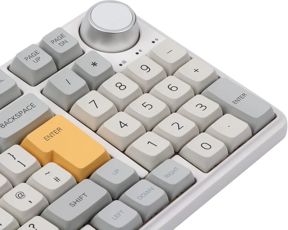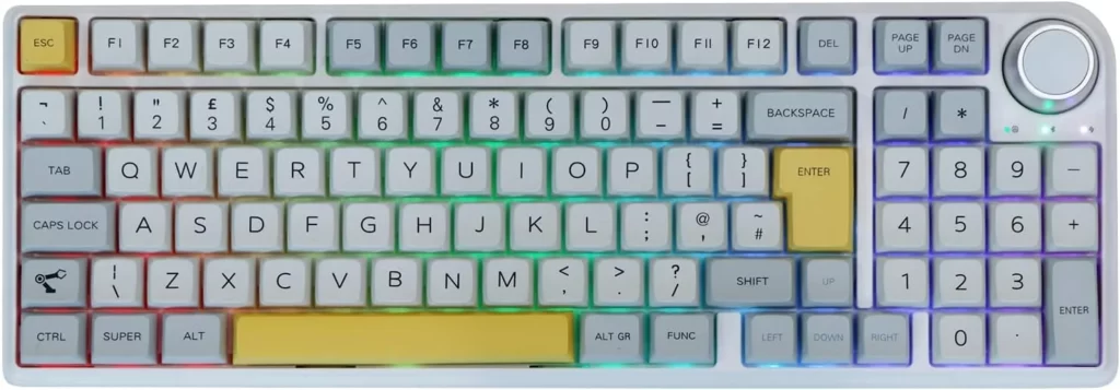 La disposición del teclado es otro de sus puntos fuertes -para mi gusto: en un tamaño apenas 5 cm superior a un teclado de 70% o si se prefiere, en un tamaño 7 cm inferior a uno completo, tenemos prácticamente las mismas teclas que éste último. Cobrando especial importancia el contar con un teclado numérico completo.